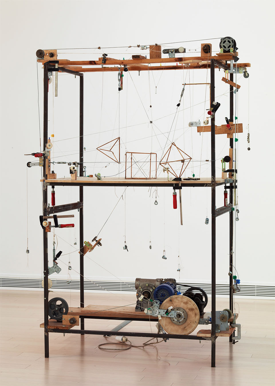 So lässt sich Attila Csörgős Installation als Neuinterpretation von Keplers bahnbrechender, wenngleich spekulativer »Weltmaschine« (1596) lesen, einer Konstruktion, die auf Basis der fünf Platonischen Körper versucht, Anzahl und Größe der zu seiner Zeit bekannten Planeten sowie deren Umlaufeigenschaften um die Sonne zu erklären. Einen humorvollen Kommentar zur »machina mundi« setzt Sigmar Polke. Unterliegen sein »Apparat« oder auch der von Wendelin Pressl womöglich Keplers neuen Kosmologie? Diese geht von einem göttlichen Bauplan auf Basis mathematischer Gesetzmäßigkeiten aus und nimmt an, das Universum sei eine einem Uhrwerk vergleichbare und damit berechenbare Maschine. Während der Beitrag von Alicja Kwade an Kepler als »Vermesser des Himmels« erinnert, dessen Berechnungen zur Umlaufbahn des Mars ergaben, dass diese nicht kreisförmig, sondern elliptisch verläuft, sind die eleganten Raum-Studien von Olafur Eliasson gedanklich verwoben mit der »magnetischen Kraft«, die nach Ansicht Keplers die Planeten auf ihrer Bahn um die Sonne hält. Bertrand Lamarches Skulptur hingegen betont die faszinierende Unergründlichkeit des Alls und zieht den Betrachter in einen geradezu magischen Sog.